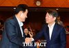 정동영 민주평화당 대표는 기자간담해 "그 당시 안 전 대표가 선거제도 개혁 말했다면 그때 대통령은 박근혜 아니라 안철수"라고 말했다. 악수하는 정동영-안철수. /이새롬 기자 |