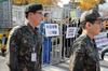 국제앰네스티 한국지부 등 시민사회 단체 회원들이 5일 오전 서울 용산구 국방부 앞에서 열린 '정부의 양심적 병역거부 징벌적 대체복무제안 반대 긴급 기자회견'에서 손팻말을 들고 퍼포먼스를 하고 있다. 군 관계자가 기자회견을 보며 이동하고 있다. [뉴스1] |