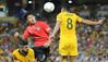 제공권이 강점인 원톱 공격수 석현준(가운데)이 지난 17일 호주 브리즈번에서 열린 호주와의 평가전서 상대 수비수와 공중 볼을 다투고 있다. 브리즈번=연합뉴스 |