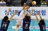 삼성화재 타이스의 공격 때 블로킹을 시도하는 한국전력. 한국전력은 국내 선수로 버티고 있다. [연합뉴스] |