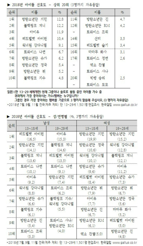 10대 남성 선호도에서 레드벨벳 아이린, 블랙핑크 제니, 트와이스 나연, 아이유 핫한 여자 아이돌 사이에 방탄소년단 지민이 2위로 랭크 됐다.