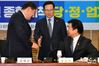 더불어민주당 홍영표 원내대표, 김태년 정책위의장, 홍종학 중소벤처기업부 장관이 20일 오전 국회 의원회관에서 열린 자영업 성장.혁신 종합대책 당.정.업계 협의에 참석하며 인사를 하고 있다.