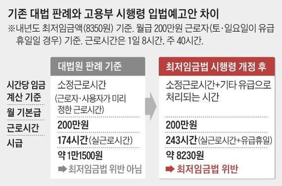 이번 시행령 개정으로 실제 일하지 않는 유급 휴일의 근로시간을 최저임금 적용 대상으로 명문화하면서, 근로기준법이 정한 주 1일 8시간만 기준으로 삼게 했다. 노사합의로 주 2일 이상 유급 주휴시간을 주기로 한 기업들의 경우, 해당 규정을 최저임금 산정 시 적용하지 않는다. 매년 결정되는 시간당 최저임금에 209시간을 곱하면 월 단위 최저임금이 나오는 것이다.
