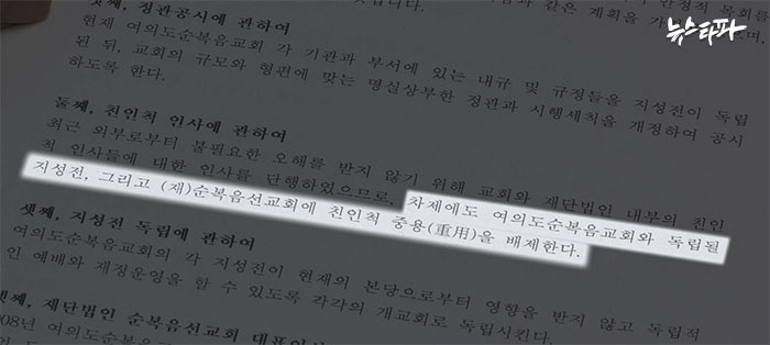 2007년 5월 방 목사가 받은 공문에는 ▲지성전 독립 ▲정관 개정 등의 내용과 함께 ▲친인척 중용 배제가 중요한 약속사항으로 담겨 있다. 순복음교회와 순복음선교회 등에서 친인척을 배제한다는 내용이었다. 하지만 이 약속은 지켜지지 않았다.