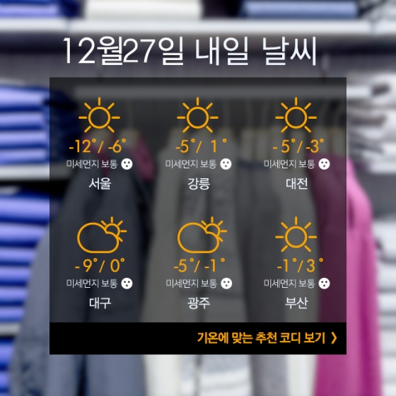 아침 최저 기온은 △서울 -12도 △강릉 -5도 △대전 -5도 △대구 -9도 △광주 -5도 △부산 -1도, 낮 최고 기온은 △서울 -6도 △강릉 1도 △대전 -3도 △대구 0도 △광주 -1도 △부산 3도 등이다.