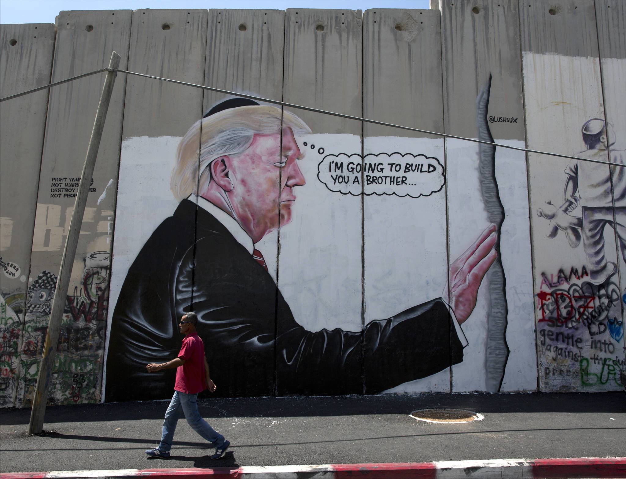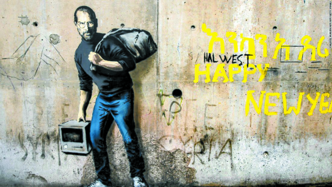 2005년엔 요르단강 서안지구에 있는 이스라엘-팔레스타인 분리 장벽에 그림으로 거대한 구멍을 뚫어버렸죠. 지난해에는 브렉시트(영국의 유럽연합 탈퇴)에 반대하는 의미에서 도버항의 한 건물 벽에 유럽연합(EU) 깃발에 있는 별 12개 중 1개를 깨부수는 사람의 그림을 남기기도 했습니다.