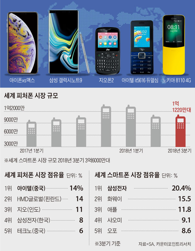 전 세계에서 가장 프리미엄폰이 강세를 보이는 국내에서도 피처폰 이용자가 여전히 600만명을 넘을 정도로 견조하다. CJ헬로가 최근 13만원짜리 바나나폰을 내놨고, 통신업체 KT에서도 중국 ZTE의 'LTE피처폰Z'를 선보였다. 국내 스마트폰 업체 관계자는 "최근 1~2년간 스마트폰에서 혁신이 사라지면서 가성비의 중국 제조사가 강세를 보였고 틈새시장에서는 피처폰이 부상했다"며 "내년에 등장할 폴더블(화면이 접히는)폰의 완성도가 하강 곡선의 스마트폰 시장을 반등시킬 수 있을지가 관전 포인트"라고 말했다.