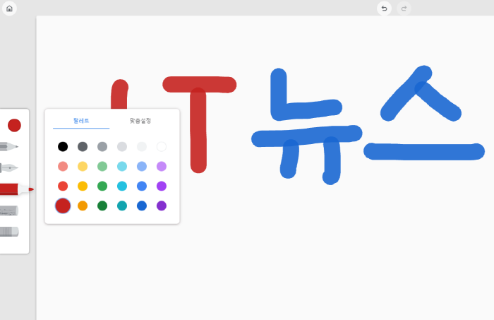 크롬 캔버스 화면 왼쪽에 연필과 펜, 마커, 분필 등 필기 도구와 지우개가 있다. 또한 화면 상단에는 홈 버튼과 실행 취소 / 재실행 메뉴 버튼이 나열되어 있다. 또한 왼쪽 도구 상단의 색상 선택 아이콘을 클릭하면 팔레트가 표시된다.