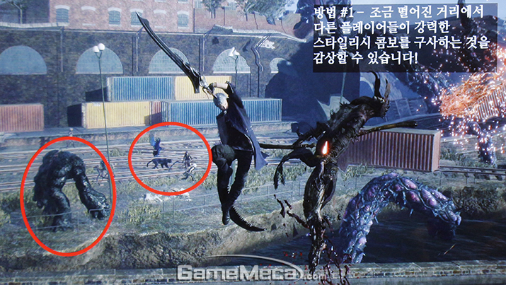 ▲ 이 장면에서 '네로'는 미션 3을 플레이 중이지만, 뒤에 보이는 'V'는 미션 4를 진행하고 있다, 이처럼 싱글 플레이 중에도 다른 유저 플레이를 감상할 수 있다 (사진: 게임메카 촬영)