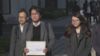 지난달 4일 일제 강제징용 피해자 변호인인 임재성·김세은 변호사가 배상 요청서를 들고 도쿄 신일철주금 본사를 방문하고 있다. /NHK |