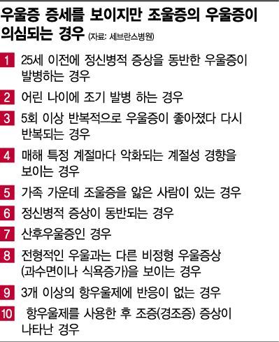 ◆우울증과 다르지만 구분 쉽지 않아…"적절한 치료시 호전"= 조울증은 우울증을 앓는 기간이 길고 정도가 약한 조증이 짧은 기간 동반돼 우울증과 구분이 쉽지 않다. 조 교수는 "조울증과 우울증은 생물학적인 기전이 달라 정확한 진단이 무엇보다 중요하다"면서 "초기 진단시 조울증을 우울증으로 진단해 항우울제를 사용하면 자칫 조울증을 악화시킬 수 있어 주의해야 한다"고 말했다. 특히 환자의 알코올 남용이나 약물 남용, 성적 문란에 대한 감독이 이뤄져야 하며, 자해나 난폭한 행동 등으로 환자의 안전에 중대한 위험이 발생하는 경우에는 입원치료를 받아야 한다.