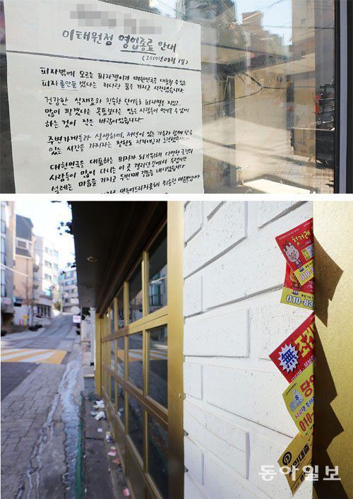 8일 서울 용산구 이태원동의 한 상가건물 유리창에 폐업 안내문이 붙어 있다. 피자 가게가 있던 이 자리는 1년 반이 되도록 새 주인을 맞지 못하고 있다. 이 동네가 소셜네트워크서비스(SNS) 등을 통해 인기를 끌면서 속칭 ‘핫 플레이스’로 뜨자 땅값과 임대료가 치솟았고 이를 감당하지 못한 영세업자들이 하나둘 동네를 떠나고 있는 것이다(위쪽 사진). 폐업한 가게들 주변에는 대부업체들이 뿌려놓은 대출 광고 전단이 여기저기 꽂혀 있었다. 전영한 기자 scoopjyh@donga.com |
