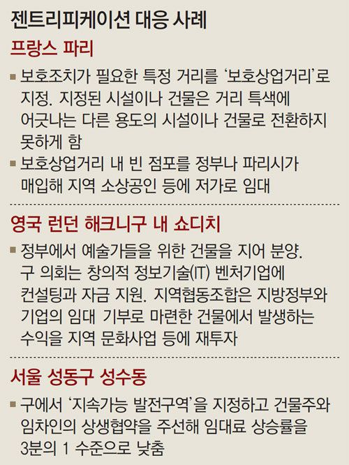 해외에서는 젠트리피케이션에 따른 문제 해결을 위해 민관이 머리를 맞댄 사례가 있다. 서울연구원이 2015년 내놓은 보고서 ‘해외 젠트리피케이션 대응 사례와 시사점’에 따르면 영국 런던시는 해크니구 쇼디치에서 활동하는 젊은 예술가와 디자이너들이 임차료 상승으로 이곳에서 밀려날 처지에 놓이자 대책을 마련했다. 정부 차원에서 예술가들을 위한 건물을 지어 분양했고 구의회는 젠트리피케이션 대응을 위한 컨설팅과 자금 조달 등을 지원했다. 해크니협동조합은 지방정부나 기업으로부터 건물을 임차하거나 기부받은 뒤 이를 예술가들에게 다시 임대했다. 이를 통해 얻는 수익은 지역 문화사업 등에 재투자해 예술가와 디자이너들에게 혜택이 돌아가는 선순환 구조를 만들었다.