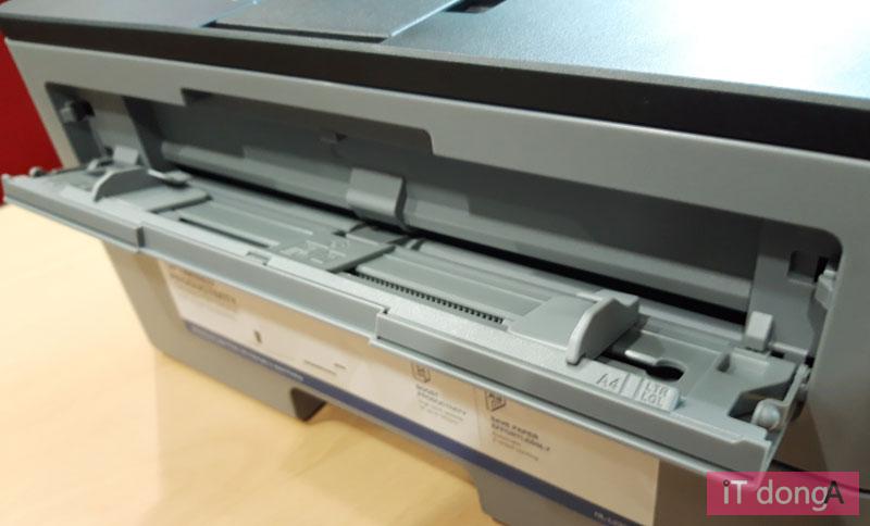 인쇄물 배출은 제품 상단에 노출된 출력부에서 이루어지며, 접을 수 있는 2개의 받침대를 이용해 최대 150매의 출력물을 지탱할 수 있다. 빈 용지는 전면 하단의 표준 용지함에 최대 250매(일반 A4 용지 기준)를 넣을 수 있다. 용지함이 상당히 큰 편이라 비즈니스 환경에 적합하다.