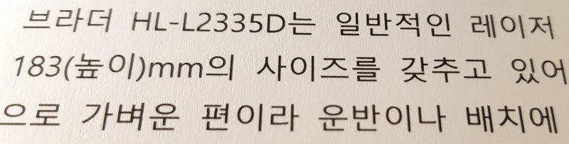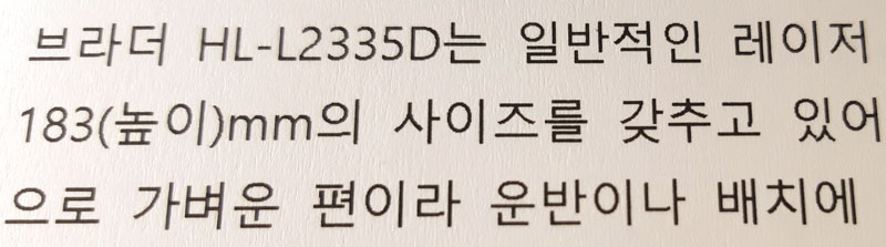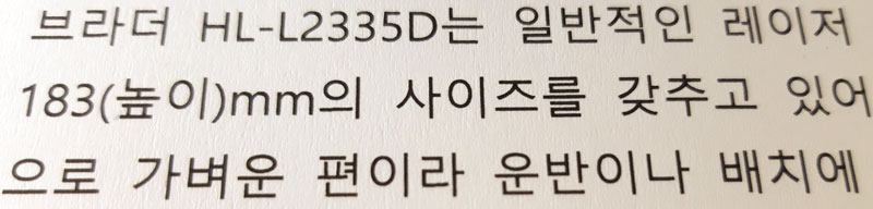 브라더 HL-L2335D는 일반적인 레이저 프린터에 비해 크기가 작은 편이다. 356(너비) x 360(길이) x 183(높이)mm의 사이즈를 갖추고 있어 사무용 책상 위에 두고 쓰기에 적합하며, 무게 역시 7.2kg으로 비교적 가벼운 편이라 운반이나 배치에 큰 어려움이 없다.![]() |