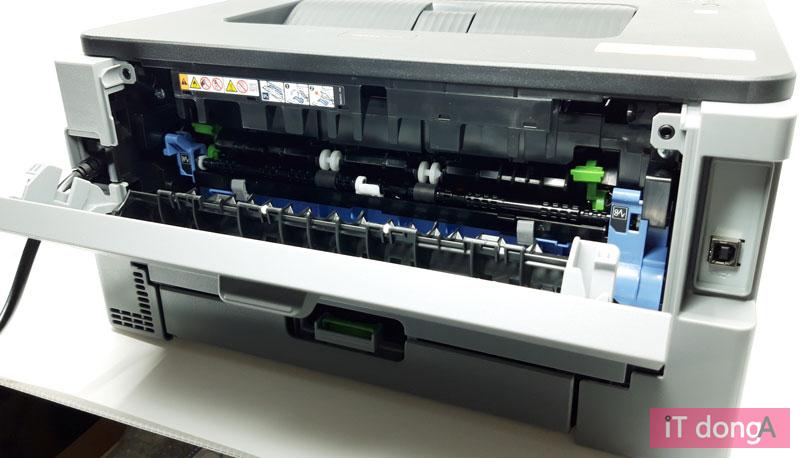 본체 후면의 외부 연결 인터페이스는 PC 연결용 USB-B 포트 및 전원 코드(본체 고정)가 유일하다. 외부 저장장치 연결 포트나 네트워크 포트 등까지 갖춘 고급형 프린터와 구분되는 점인데, 제품의 콘셉트나 가격을 고려해보면 납득할 만하다. 사실 태반의 이용자들이 저런 부가 기능 보다는 단순 출력 용도로만 프린터를 쓰는 일이 많기 때문이다. 그리고 후면 상단의 손잡이를 당기면 외부 패널을 열 수 있는데, 이를 통해 종이 걸림 등의 장애에 손쉽게 대응할 수 있다.