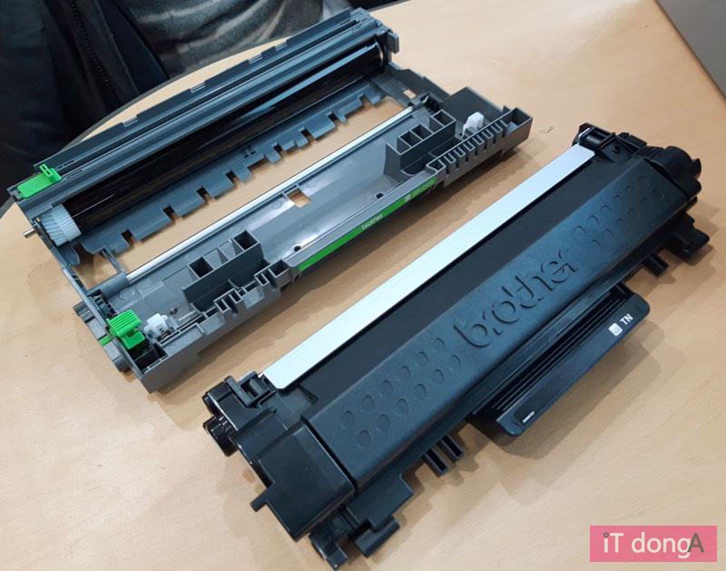 전면 상단의 커버를 열면 토너 카트리지 및 드럼의 교환이 가능하다. 표준형 토너인 TN-2460은 최대 약 1,200 페이지, 대용량 토너인 TN-2480은 최대 약 3,000 페이지의 출력이 가능하다. 인터넷 최저가 기준으로 표준 토너는 3만 9,500원, 대용량 토너는 7만 100원 정도에 팔리고 있는데, 장당 토너 소모 비용은 각각 32.9원, 23.4원 정도다. 대용량 토너의 비용 효율성이 확실히 돋보이며, 표준 토너의 효율성도 업계 평균 수준은 된다.