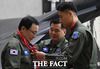 [더팩트ㅣ오산=이새롬 기자] 이해찬 더불어민주당 대표(왼쪽)와 민주당 지도부가 31일 오전 경기도 오산 공군작전사령부를 방문한 가운데, 이 대표가 공군의 '빨간 마후라'를 착용하고 있다.