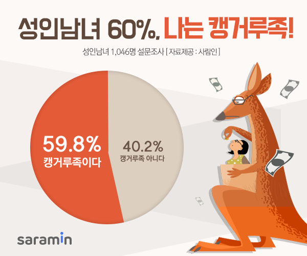 구인구직 매칭플랫폼 사람인이 성인남녀 1046명을 대상으로 ‘캥거루족’에 대해 조사한 결과 59.8%가 본인은 캥거루족이라고 1일 답했다.