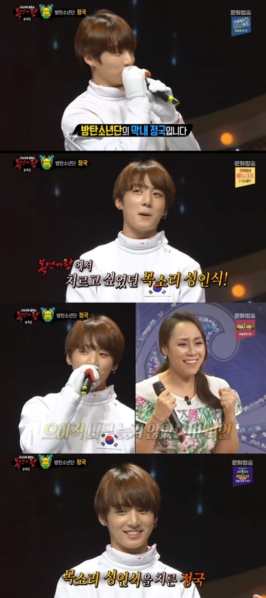이날 방송에는 2016년 8월 펜싱맨 복면을 쓴 정국의 모습이 공개됐다. 지금보다 앳된 얼굴과 목소리의 정국은 청아하고 달콤한 목소리로 귀를 사로잡았다.