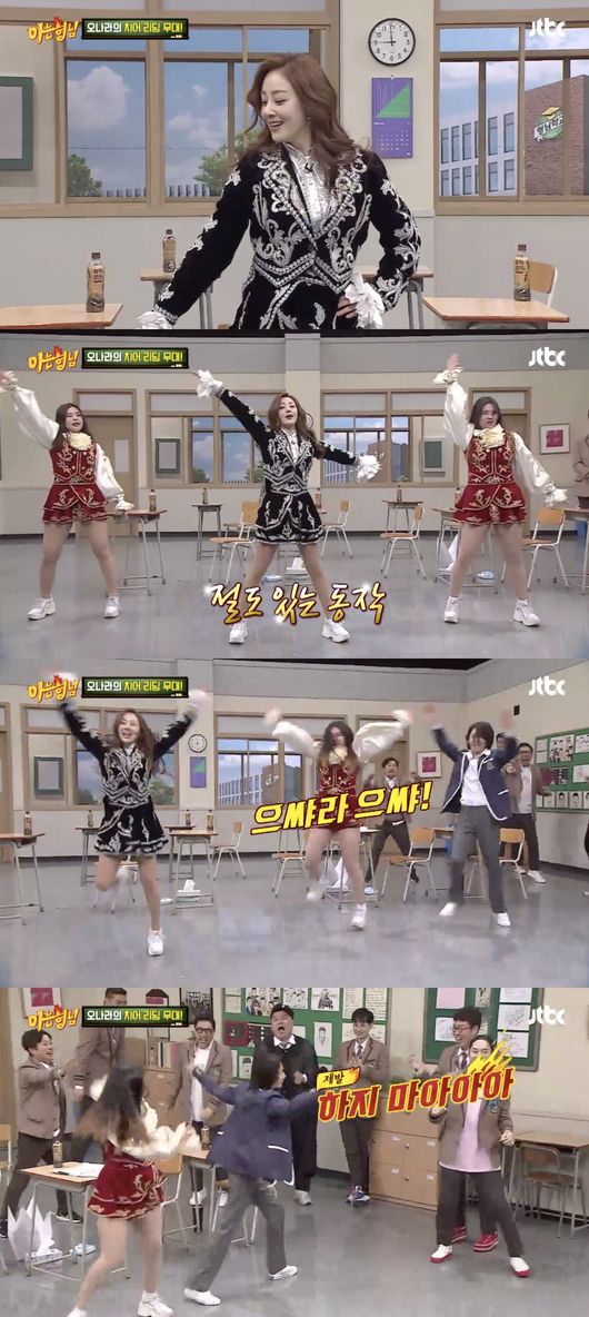 오나라는 경희대 응원단 출신이라며 당시 경기장에서 서장훈을 자주 봤다고 밝혔다. 응원단장 옷을 입고 등장한 오나라는 22년만에 해본다며 경희대 응원단 후배들과 함께 열정적인 치어리딩 무대를 선보여 눈길을 끌었다.