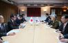 △강경화(오른쪽 앞에서 두번째) 외교장관과 고노 다로(왼쪽 두번째) 외교장관이 1월 23일 스위스 다보스에서 열린 회담에서 대화를 하고 있다. [사진=AFP제공] |