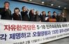 14일 오전 서울 영등포구 자유한국당 당사 앞에서 지지자들이 5ㆍ18 북한군 개입 진상규명 촉구 기자회견을 하고 있다. [연합] |