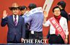 [더팩트 | 대전=남윤호 기자] 김진태, 오세훈, 황교안 당 대표 후보자(왼쪽부터)가 14일 오후 대전 중구 한밭종합운동장에서 열린 자유한국당 제3차 전당대회 충청·호남권 합동연설회에 참석해 공직 선거 서약식을 하고 있다.