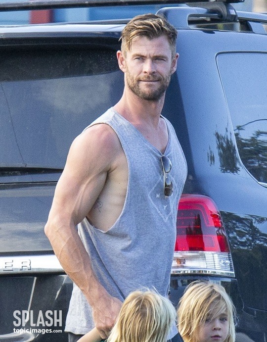 공개된 사진 속 크리스 헴스워스는 민소매 티셔츠를 입고 우람한 팔근육을 과시하고 있는 모습. 미모의 아내 및 세 자녀와 함께 있는 모습이 행복해 보인다.