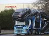 18일(현지시간) 영국 스윈든 혼다 공장에서 차를 싣고 떠나는 운송차량. [AP] |