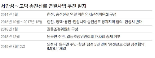 이에 따라 한전은 2014년 5월부터 서안성 변전소에서 평택 반도체캠퍼스가 입주한 고덕신도시까지 전체 23.86㎞ 구간에 송전탑 35기 등을 건설하는 송전선로 연결사업에 들어갔지만, 중간에 위치한 안성 원곡면 주민들이 건강권과 재산권을 침해당한다며 원곡면을 통과하는 4㎞ 구간 전체 지중화를 요구하면서 갈등이 시작됐다. 한전은 마을을 통과하는 구간을 제외한 산악지대는 지중화가 불가능하다며 맞서 결국 송전선로 연결사업이 중단됐다.