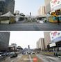 지난 7일 오후 서울 광화문광장 남쪽에 세월호 천막 14동이 자리 잡고 있다(위쪽 사진). 아래 사진은 18일 천막이 철거된 후 서울시 관계자들이 마무리 작업을 하고 있는 모습. 철거는 이날 오전 10시 반쯤 시작돼 약 7시간 만에 끝났다. /남강호 기자 |