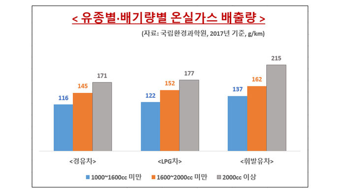 하지만 차량이 배출하는 것은 단지 미세먼지만이 아니다. 미세먼지와 함께 지구환경에 문제를 일으키는 것은 지구온난화를 일으키는 온실가스인 이산화탄소(CO2)다. 국립환경과학원이 2017년 기준 차량 유종별 온실가스 배출량을 보면 LPG 차량의 온실가스 배출량이 결코 적지 않다. 같은 배기량일 경우 경유차의 이산화탄소 배출량이 가장 적고, 이어 LPG 차, 그리고 휘발유차가 가장 많이 배출하는 것으로 되어 있다. 예를 들어 배기량 2,000cc 이상의 경우 1km당 배출하는 이산화탄소는 휘발유차가 215 그램(g)으로 가장 많고 이어 LPG 차 177g, 경유차 171g 순이다(아래 그림 참조). 만약 LPG 차가 미세먼지를 많이 배출하는 경유차를 대체한다며 온실가스는 LPG 차 확대·보급 이전보다 오히려 더 늘어날 가능성이 있다. 결국 LPG 차량이 여러 장점이 있는 것은 사실이지만 지구환경 전체를 고려할 때 결코 궁극적인 대안이 될 수는 없다는 뜻이다.