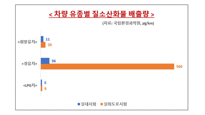 먼저 실내시험 결과를 보면 1km 주행을 가정할 경우 LPG 차량이 배출하는 질소산화물 양은 5㎍으로 경유차의 36㎍, 휘발유차의 11㎍과 비교하면 크게 적다. 실외도로시험 결과를 봐도 LPG 차량이 배출하는 질소산화물의 양은 6㎍으로 경유차가 배출하는 560㎍의 1% 수준에 불과하다. 휘발유차가 배출하는 20㎍과 비교해도 30%에 불과하다(아래 그림 참조).