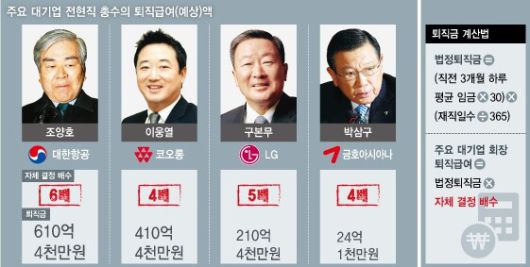 금호아시아나그룹은 사업보고서를 통해 최대 배수가 4임을 밝힌 바 있다. 이에 따라 최근 유동성 위기와 외부감사인 ‘한정’ 의견 제출 사태 등에 책임을 지고 경영 일선에서 물러난 박 전 회장은 아시아나항공과 금호산업으로부터 약 24억원의 퇴직금을 받을 수 있는 것으로 계산됐다. 엘지(LG)와 케이티(KT)는 취재 결과 지급 배수가 5였다. 이에 맞춰 고 구본무 회장은 ㈜엘지에서 지난해 퇴직금 210억원을 받았다. 2014년 취임한 황창규 케이티 회장의 경우 지난해 연봉 14억5천만원을 받았으므로 퇴직금이 30억원을 넘어설 것으로 보인다.