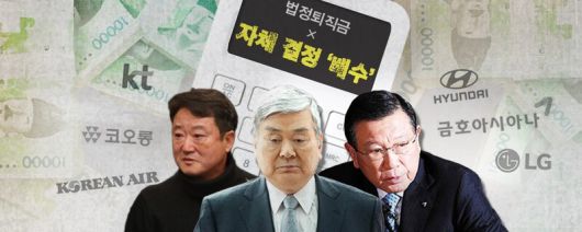 재벌 회장의 ‘퇴직금’은 누가, 어떻게 결정할까? 이웅열 코오롱 전 회장은 지난해 경영 퇴진을 선언한 뒤 410억원을 퇴직급여로 받게 됐다. 최근 주주총회에서 밀려난 조양호 대한항공 대표이사가 받게 될 퇴직금은 610억원에 이를 수 있다고 한다. 박삼구 금호아시아나그룹 전 회장은 자신의 경영 실패로 중국계 기업에 매각된 금호타이어에서 퇴직금 22억원을 결국 받아냈다. 재벌 회장들의 퇴직금은 알 수 없는 것투성이다. 상상을 초월하는 천문학적 규모는 물론이고, 꽁꽁 감춰진 산정 기준과 경영 실패는 반영하지 않는 자의적 지급 결정 등이 그렇다.
