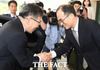 민갑룡 경찰청장(왼쪽)이 2018년 8월10일 오후 서울 서초구 반포대로 대검찰청을 찾아 문무일 검찰총장을 면담한 뒤 청사를 나서며 악수를 하고 있다./이새롬 기자 |