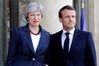 에마뉘엘 마크롱(오른쪽) 프랑스 대통령이 9일(현지시간) 브렉시트 회담을 위해 프랑스 파리 엘리제궁에 도착한 테레사 메이 영국 총리를 반갑게 맞이하고 있는 모습. [로이터] |