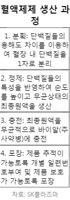 ![SK플라즈마 직원이 최신 자동화 크로마토그래피 설비를 이용하여 혈장으로부터 혈액제제를 정제하고 있다. 오른쪽 노란색으로 보이는 액체가 혈장이다. 보안상 사진 및 동영상 촬영이 엄격히 금지돼 있어 사진은 업체측으로부터 받았다. [사진 SK플라즈마]](http://static.news.zumst.com/images/2/2019/04/11/11cff7ab6cbf43d98a9a8c78ceb90ba3.jpg)