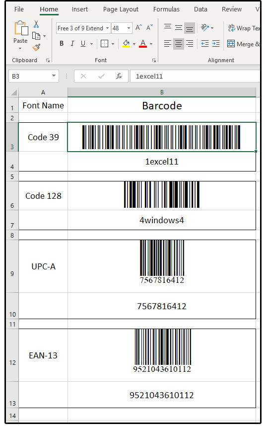 마우스 커서로 B3 셀을 가리키고 홈 탭, 글꼴 그룹에서 3 of 9 Extend 글꼴을 선택한다. 오른쪽 하단의 작은 화살표를 클릭해서 C:\Windows\Fonts 폴더에 있는 모든 시스템 글꼴 목록을 표시한 다음 아래로 스크롤해서 해당 글꼴을 찾아 클릭한다.