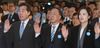 이낙연 국무총리(왼쪽부터)와 홍남기 부총리 겸 기획재정부 장관, 유은혜 부총리 겸 교육부 장관이 세월호 참사 5주기인 16일 정부세종컨벤션센터에서 열린 국민안전 다짐대회에서 안전관리헌장을 낭독하고 있다 뉴시스 제공 |