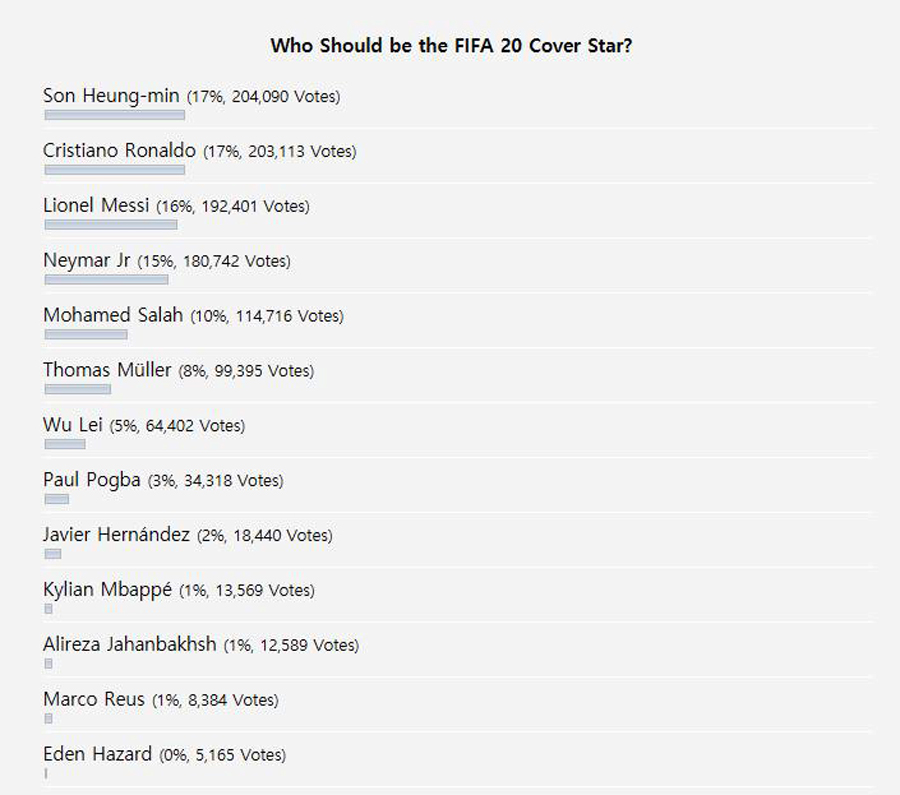 이 매체는 피파 컨텐츠를 다루는 ‘FIFPlay'를 인용해 손흥민이 현재 메인 모델 투표에서 1위를 달리고 있다고 전했다. 현재 손흥민은 204,090표로 전체 중 17%의 선택을 받아 선두를 달리고 있다. 2위는 호날두로 203,113표, 3위는 메시로 192,401표를 받았다.