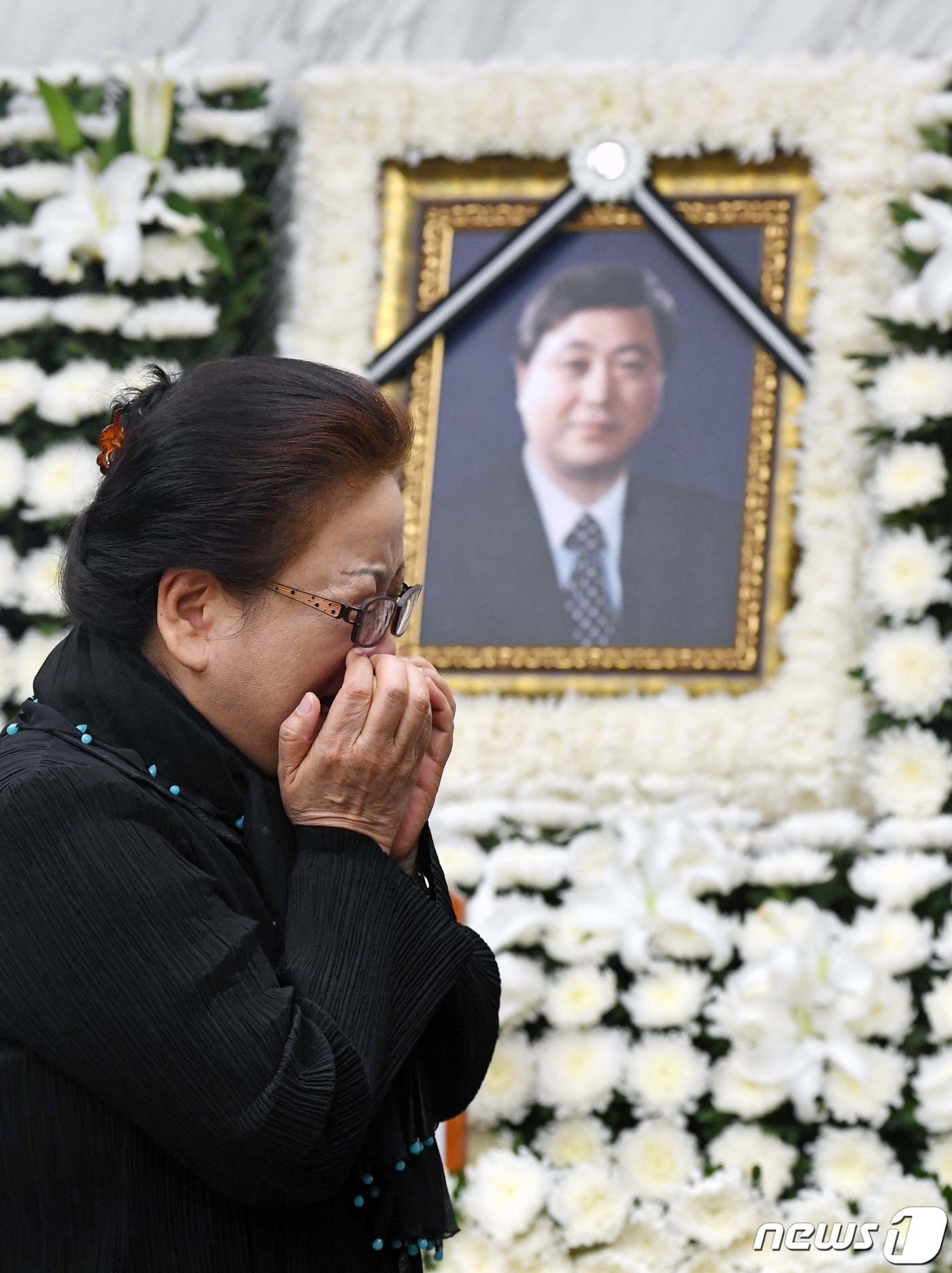(서울=뉴스1) 박세연 기자 = 21일 서울 서대문구 신촌세브란스병원 장례식장에 마련된 고 김홍일 전 민주당 의원의 빈소에서 이윤자 전 국회의원이 오열하고 있다. 2019.4.21/뉴스1psy5179@news1.kr[© 뉴스1코리아(news1.kr), 무단 전재 및 재배포 금지]