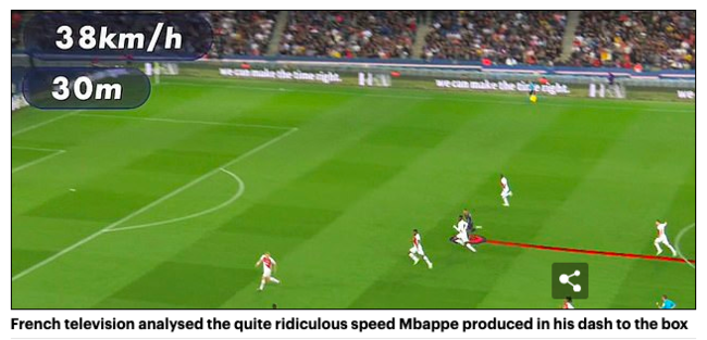 영국 데일리메일은 23일 “음바페가 38km/h의 스프린트 속도를 기록했다. 우사인 볼트가 100m 세계 신기록(9.58초)을 세울 때 평균 속도보다 빨랐다”고 전했다. 프랑스 TV가 음바페의 30m 질주 스피드를 계산했다. 음바페는 지난해 러시아월드컵에서도 38km/h 스피드를 기록한 바 있다.