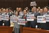 황교안 자유한국당 대표(오른쪽 세번째), 나경원 원내대표(오른쪽 네번째) 등 한국당 지도부를 비롯한 소속 의원들이 23일 오전 국회에서 열린 긴급 의원총회에서 여야 4당이 선거법 개정안과 고위공직자비리수사처 법안을 패스트트랙(신속처리안건 지정)으로 지정한 데 대해 항의하는 피켓을 들고 있다. 한국당은 지난 20일에 이어 오는 27일 서울 광화문 세종문화회관 앞에서 대규모 장외집회를 열 예정이다. 사진=박범준 기자 문희상 국회의장은 23일 선거제·개혁 법안 패스트트랙 처리 방향에 대해 "기본적으로 선거제는 합의에 의해 되는 것이 지금까지 관행이고 앞으로도 그렇게 되는 것이 최선"이라며 합의를 통한 처리를 당부했다.