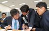 사법개혁법안 패스트트랙 적용에 반대하는 바른미래당 유승민 전 대표(왼쪽부터)가 유의동, 오신환 의원이 25일 오전 국회 의사과에서 인편이나 팩스를 이용해 사법개혁특별위원회 간사인 오신환 의원 사·보임계 접수를 저지하기 위해 대기하며 대화하고 있다.(사진=연합뉴스) |