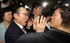 선거제 개편안과 사법제도 개혁안의 패스트트랙 지정을 놓고 여야의 극한 대치가 이어지는 가운데 26일 새벽 서울 여의도 국회 본청 의안과 앞에서 더불어민주당 홍영표 원내대표 와 자유한국당 송석준 의원이 설전을 벌이고 있다./사진=뉴시스 |