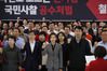 26일 오후 서울 여의도 국회 로텐더홀에서 자유한국당 나경원 원내대표 등이 검경수사권조정 법안이 다른 경로로 접수되었다는 소식을 전해들은 뒤 구호를 외치고 있다.(사진=연합뉴스) |