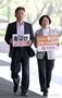 이상규 민중당 상임대표와 김미희 전 통합진보당 국회의원이 3일 서울 서초구 서울중앙지검에서 황교안 전 법무부 장관(현 자유한국당 대표)에 대한 사법농단 재판거래 개입 등의 혐의로 고발장을 접수하기 위해 민원실로 향하고 있다./사진제공=뉴시스 |