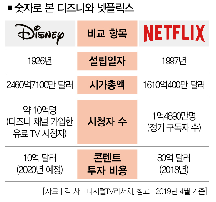 그런데, 울고 웃은 두 기업의 비전이 참으로 흥미롭습니다. 넷플릭스와 월트디즈니가 점점 '닮은꼴'이 돼가고 있기 때문입니다. 4월 11일(현지시간) 월트디즈니는 올 11월 12일부터 OTT 서비스 '디즈니플러스'를 시작하겠다고 발표했습니다. 넷플릭스처럼 자체적으로 콘텐트를 유통하겠다는 겁니다. 미국 출시를 시작으로 2021년까지 북미·유럽·아시아 등 서비스 지역을 점차 넓히겠다는 포부도 밝혔죠. 이용료는 월 6.99달러로 넷플릭스(10.99달러)보다 저렴합니다.